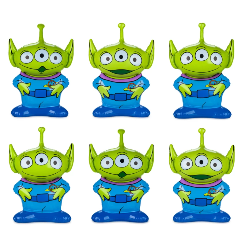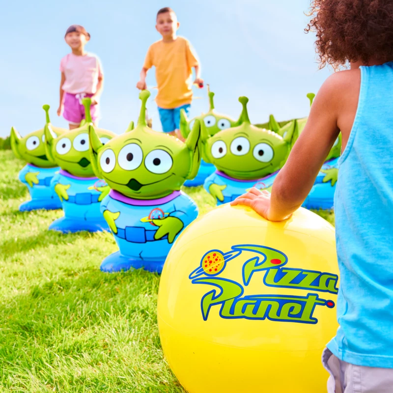 - Bowling game includes six inflatable Space Aliens and inflatable Pizza Planet ball