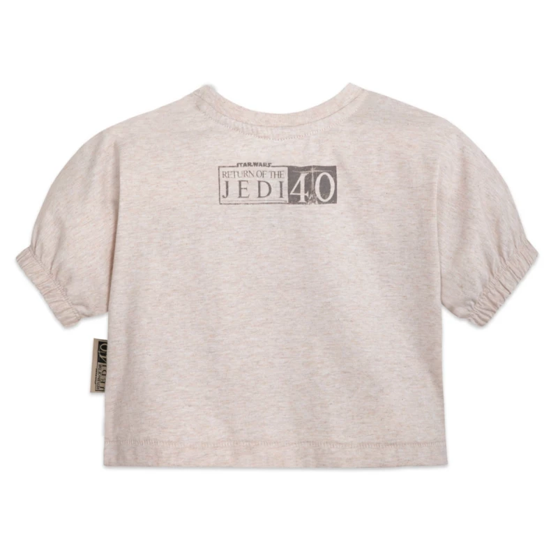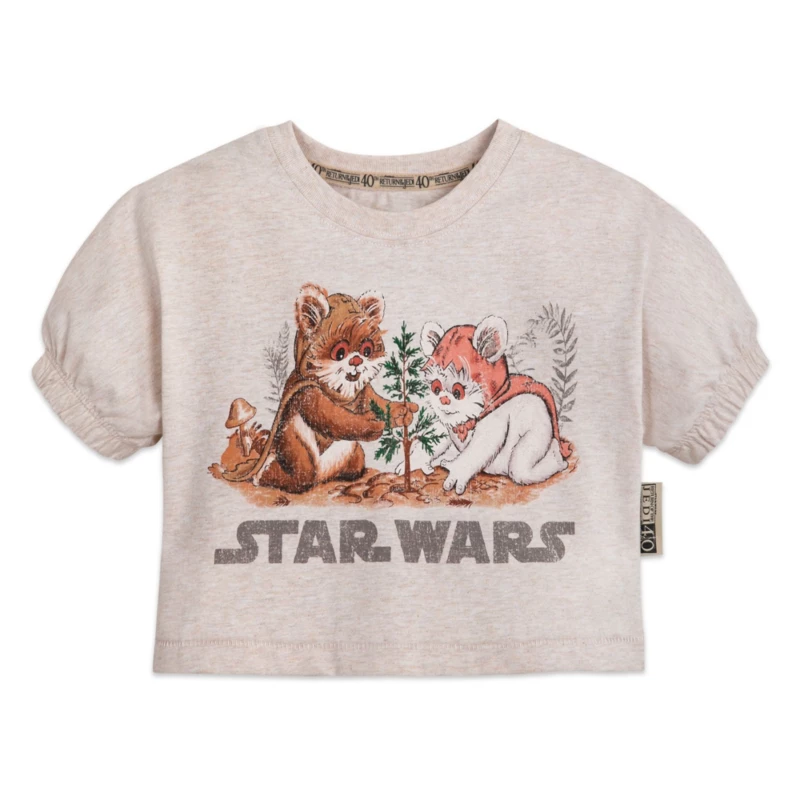 Wicket and Princess Kneesaa of Endor plant a tree on this adorable Ewoks fashion top inspired by Star Wars: Return of the Jedi. What better way to celebrate the film’s anniversary than by adding to the Forest of Endor, where one of the film’s greatest adventures takes place. The screen art’s distressed look and the Star Wars: Return of the Jedi 40th Anniversary stamp, woven tag and neck tape add vintage appeal to this cropped top with pretty puff sleeves. It’s the perfect way to ”Alaay loo ta nuv,” which means ”celebrate the love,” of the beloved film.