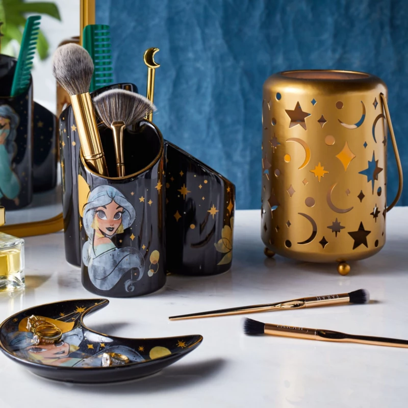 Take your beauty station to a whole new world with this Jasmine makeup brush holder. Inspired by Disney’s Aladdin (1992), this holder contains three attached cups, goldtone rod with crescent moon topper, and stunning artwork of Jasmine.