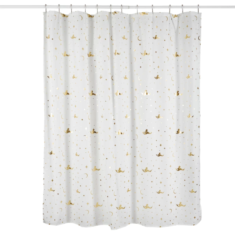 Take your bath time to a whole new world with this Jasmine shower curtain. This shimmering shower curtain features an allover gold foil print of Jasmine’s and Aladdin’s silhouettes flying through the night sky that adds a touch of magic to your bathroom.