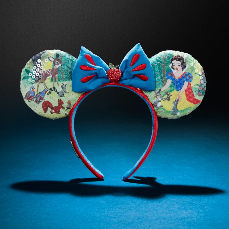 The fairest of all will cast a spell of enchantment over the Magic Kingdom in this happy ear headband featuring sequined-covered ears and vintage Snow White storybook illustrations, a deluxe bow with embroidered ”insets” plus a gem-studded apple brooch. I’m wishing for one now!