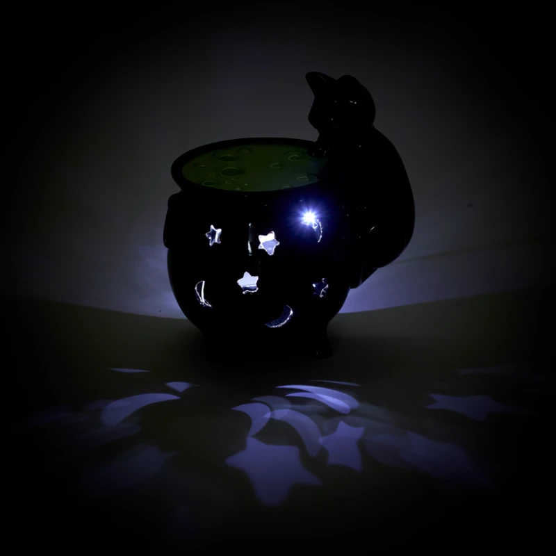 - Sculpted cauldron lantern with star and moon cut-outs for a frightful eerie glow